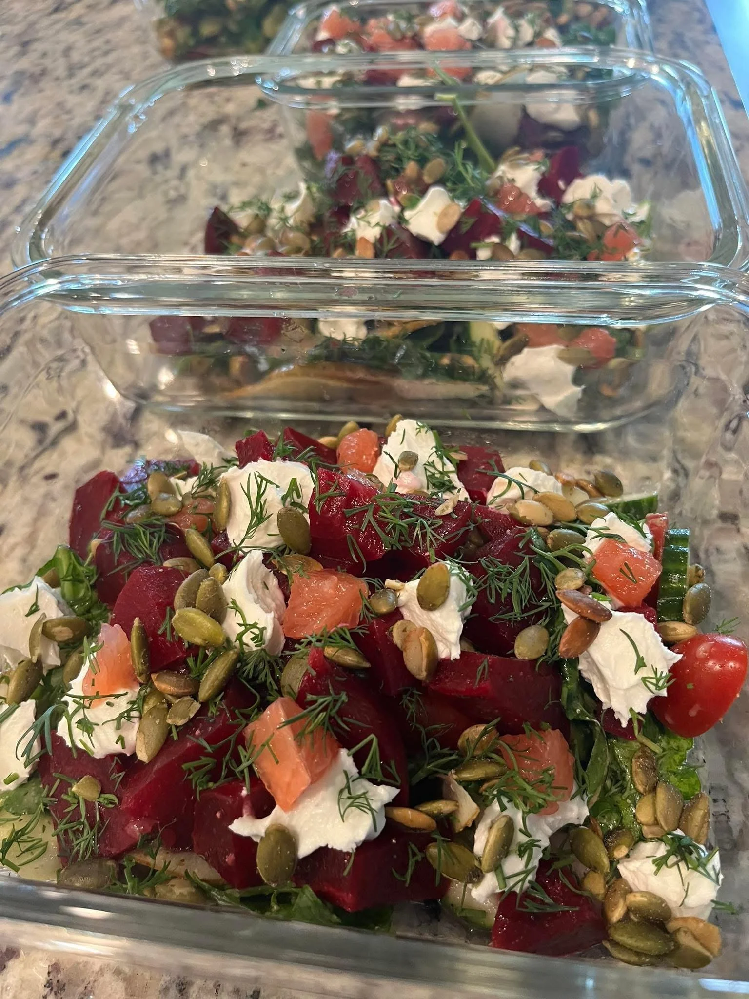 Multiple glass bowls and dishes filled with layered salads topped with greens, herbs, pine nuts, grated cheese, and vegetables on a kitchen countertop.