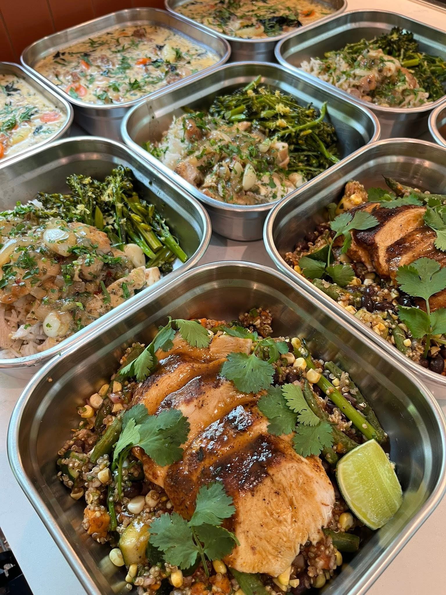 Assorted Asian-inspired dishes in glass containers, including stir-fried vegetables, grilled chicken, and rice, garnished with chopped cilantro and sesame seeds.