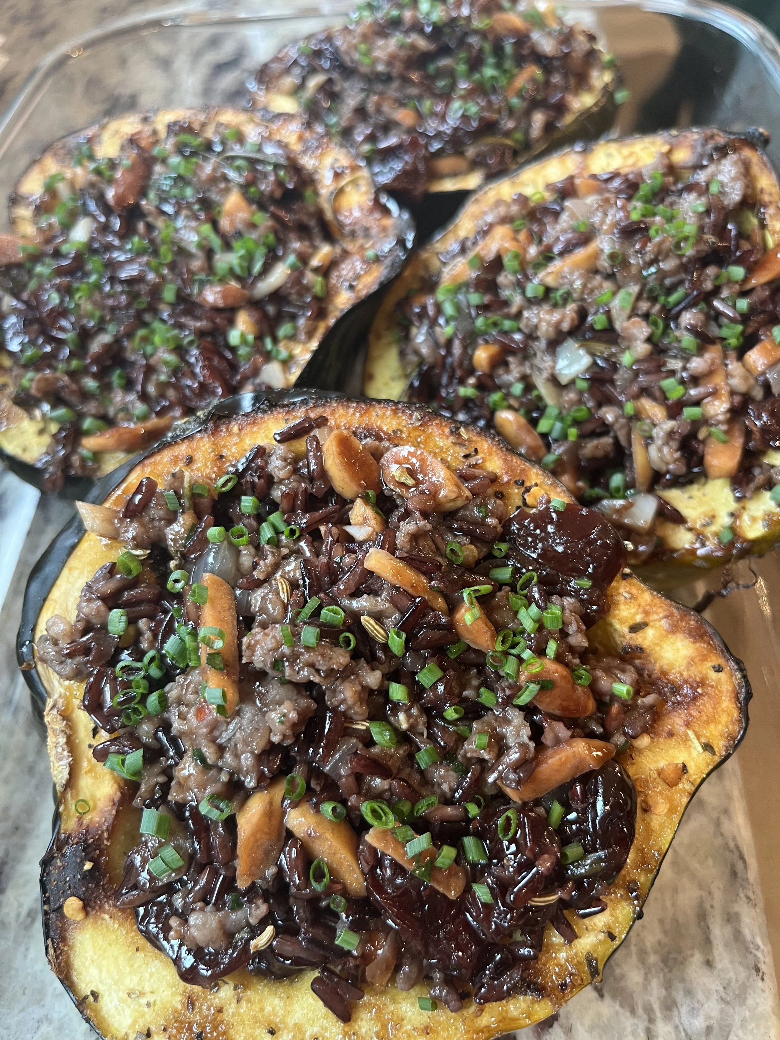 Stuffed roasted acorn squash topped with a mixture of ground meat, rice, vegetables, and chopped green onions.