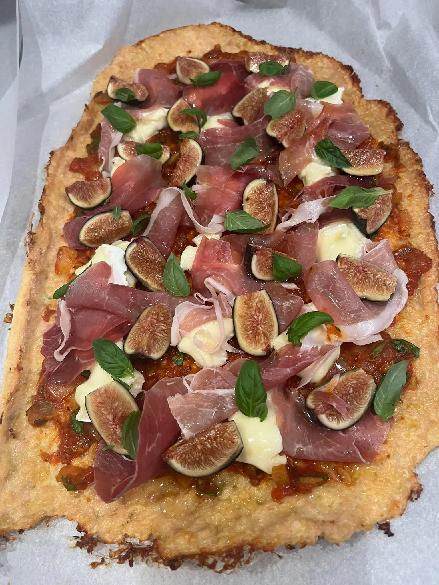 Two uncooked rectangular pizzas on baking sheets topped with pepperoni slices, shredded cheese, and fresh basil leaves.