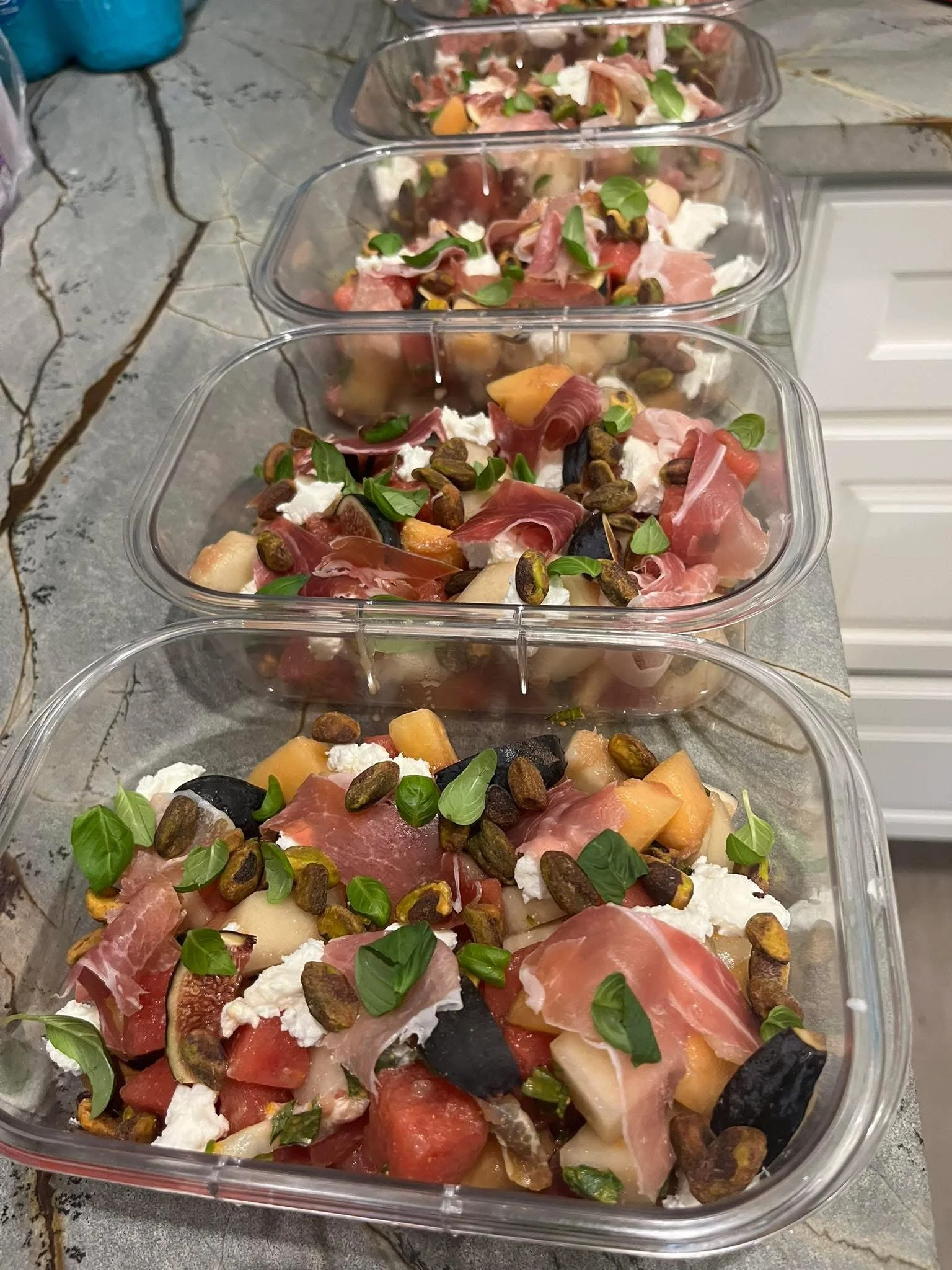 Four clear food containers on a gray stone countertop filled with Italian antipasto salad ingredients, including cured meats, cheese, fresh tomatoes, basil, black olives, and green herbs.